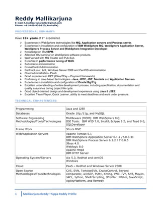 This document provides a summary of Reddy Mallikarjuna's professional experience and qualifications. He has over 10 years of experience in IT with expertise in WebSphere technologies, IBM MQ, application servers, Linux administration, and Java/J2EE development. His current role is as a senior technical lead for HCL Technologies where he works as the system administrator and release manager for the Bank Payment Hub project in Australia.
