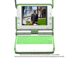 The document discusses the Plan Ceibal initiative in Uruguay, which aims to enhance educational equity and learning through technology, providing laptops and internet access to students. It highlights the positive impact on student engagement, teacher satisfaction, and the development of new pedagogical approaches, despite challenges such as the need for teacher training and effective assessment methods. The initiative emphasizes the importance of expanding educational environments and fostering creativity and self-directed learning in students.