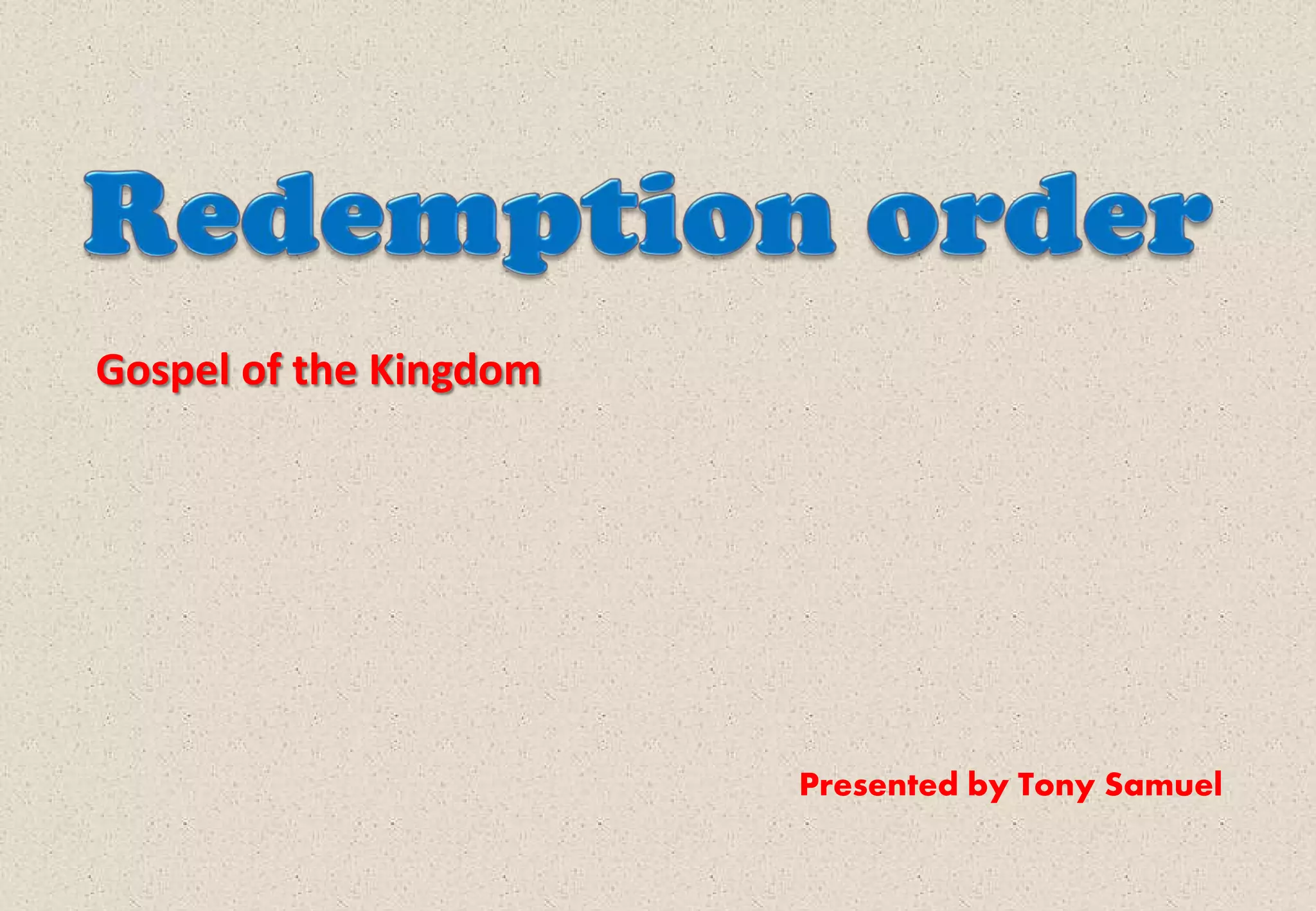 The document discusses the four orders - Creation, Israel, Redemption, and Church. It provides details on each order, including who initiated it, their message, how they communicated it, and the result. It also discusses the redemption order in more depth, noting that Jesus initiated it and Apostle Peter was given the keys of the kingdom of heaven to open it on the day of Pentecost. The process of moving from Satan's kingdom to God's kingdom through the redemption order is also summarized.