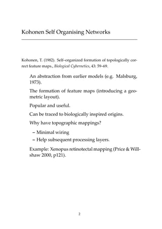 This document discusses self-organizing neural networks, including Kohonen networks and Adaptive Resonance Theory (ART). It provides details on Kohonen networks such as their basic structure, learning algorithm using neighborhoods, and biological origins. ART is introduced as a way to address the stability-plasticity dilemma in neural networks. The key aspects of ART1 are summarized, including its orienting and attentional subsystems, short and long term memory representations, and learning algorithm using a vigilance test. Examples of a Kohonen network and ART1 network are also included to illustrate their operation.