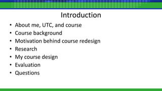 Kathy Winters from the University of Tennessee Chattanooga discusses the redesign of a freshman-level computer concepts course to improve student engagement and performance, influenced by issues with traditional textbook reading habits among students. The new course format, incorporating SAM training and interactive video content, aims to enhance learning retention through semi-self-paced modules, resulting in better grades and increased interest. Evaluation of the course indicates advantages such as improved student satisfaction and cost-effectiveness, alongside areas for future enhancement.