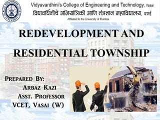 This document provides information about redevelopment and residential townships. It defines redevelopment as demolishing old structures and replacing them with new structures having new dimensions and space. Reasons for redevelopment include dilapidated buildings that are on the verge of collapse or cannot be easily repaired. The document outlines the process and documents required for redevelopment in India. It also discusses the merits and demerits of redevelopment. Additionally, it defines residential townships and provides advantages such as exceptional living experiences, security, and amenities, as well as potential disadvantages like high costs and long construction periods.