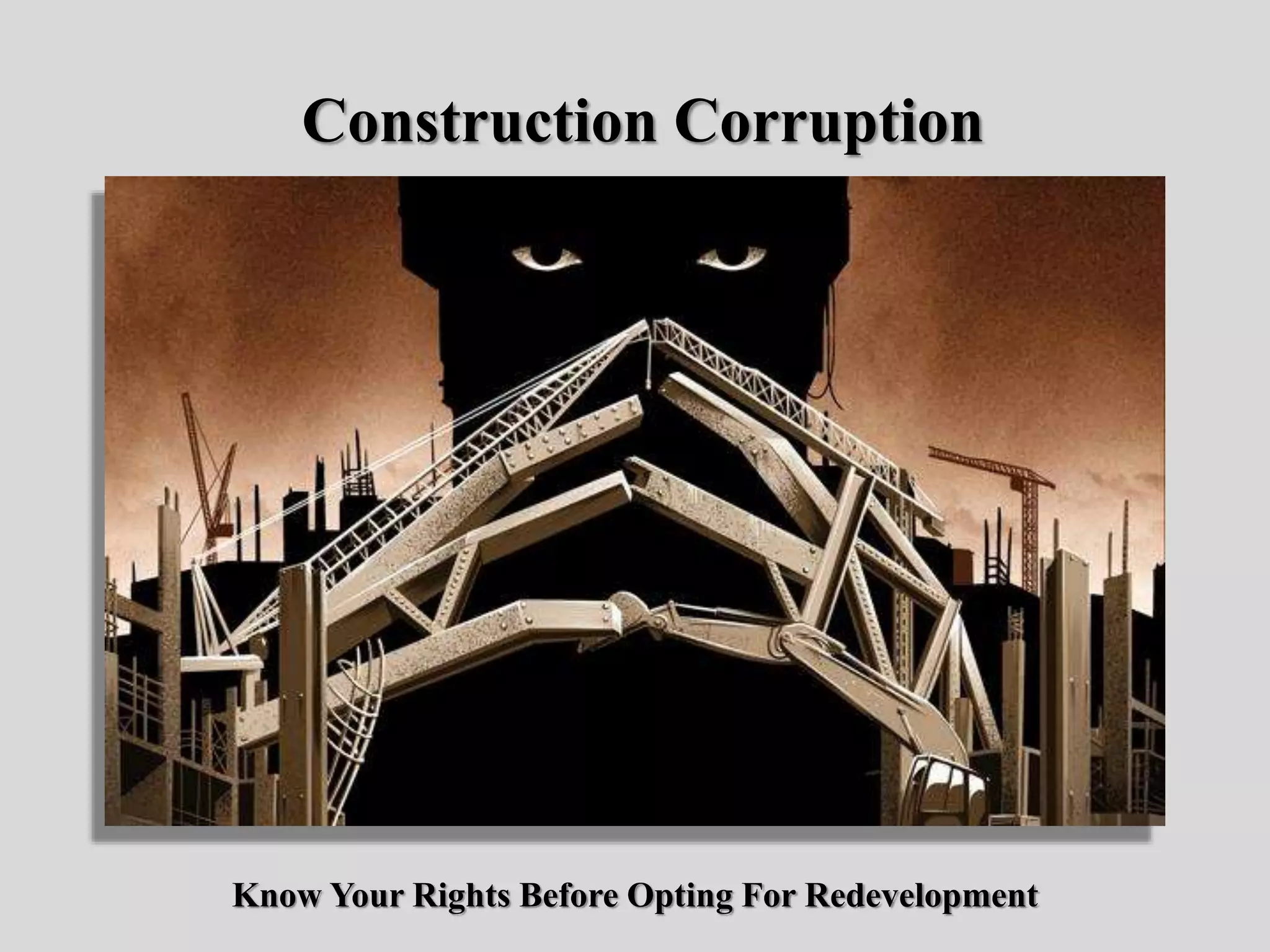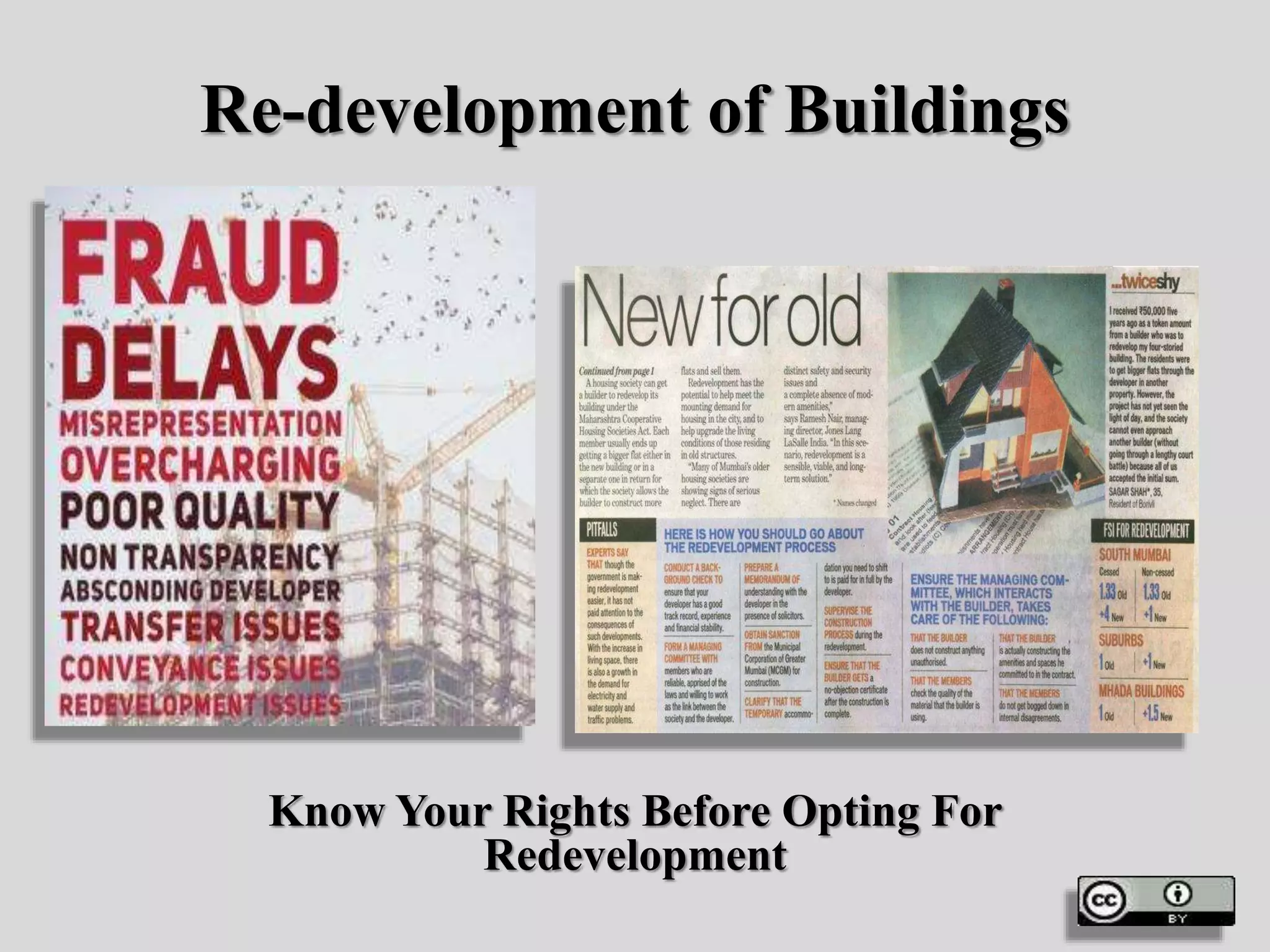 The document provides information on the redevelopment process for societies residing in old buildings located in prime areas. It discusses key considerations and steps societies should take before opting for redevelopment, including getting a structural audit report, circulating the report to members, obtaining written consent from members, and carefully selecting a developer. The document also outlines advantages like additional area and modern amenities, and disadvantages like disruption and increased maintenance costs. Overall, it emphasizes the importance of transparency, legal agreements, and following due process to ensure a successful redevelopment.