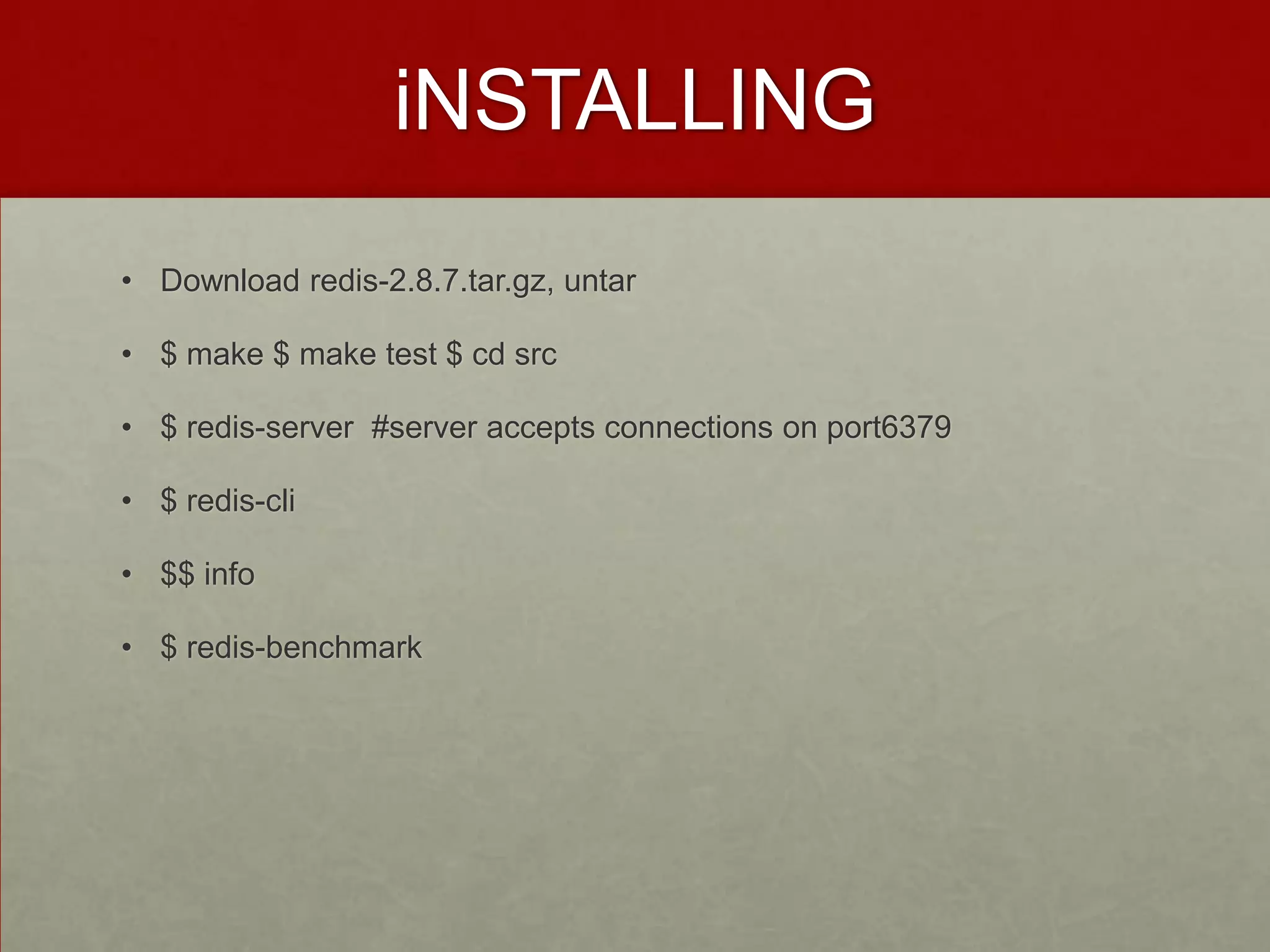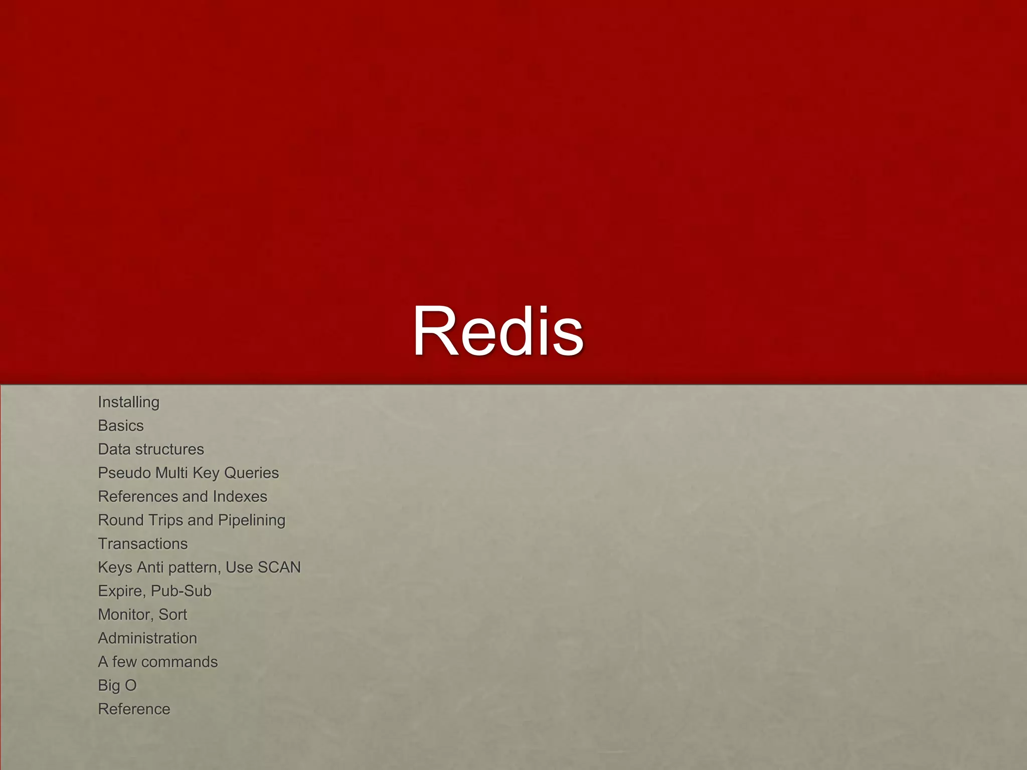 Redis is an in-memory data structure store that can be used as a database, cache, and message broker. It supports strings, hashes, lists, sets, sorted sets with operations like gets, sets, incr, and exploring data structures. Redis also supports transactions, pub/sub, LRU caching, and replication. Common commands provide basic CRUD operations and data structure operations with time complexities from O(1) to O(N+M*log(M)).