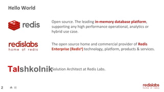 The document provides an overview of Redis Modules, which allow Redis to be extended through dynamically loaded libraries written in C. Some key modules discussed include ReJSON for storing and querying JSON documents natively in Redis, RediSearch for full-text search capabilities, and ReBloom for implementing scalable Bloom filters. Redis Modules can be used to add new data types, commands, and capabilities to Redis in order to adapt it to specific use cases and data models. Performance benchmarks show modules like ReJSON providing significant performance advantages over alternatives that rely on Redis' core data structures and Lua scripting.