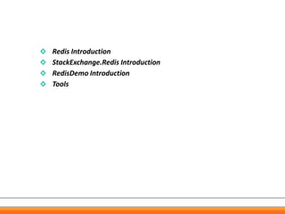 The document provides an overview of Redis, an open-source key-value NoSQL database known for its in-memory data structure and atomic operations. It discusses its features, usage in various applications including Stack Exchange, and provides insights into persistence, caching strategies, and performance optimizations. Additionally, it covers configuration options, basic usage, and tools for managing and interfacing with Redis.