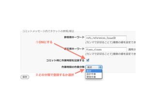 Redmine 1.1 (2011/01) http://blog.redmine.jp/articles/new-feature-1_1/automatic-spent-time-logging/ チケット番号に加えて作業時間をコミットメッセージに記載 ○○画面の表示不具合(カラム落ち)を修正。 refs #9999 @2.5h チケットとリビジョンを関連づけるのと同時に チケットに作業時間を記録できる。 コミットと同時に作業工数を記録できるので開発者の手間を軽減。