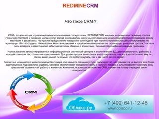 Документ описывает систему управления взаимоотношениями с клиентами RedmineCRM, которая направлена на улучшение продаж и взаимодействия с клиентами. Основные функции включают управление контактами, анализ продаж, телефонные продажи и маркетинговые кампании. Внедрение данной системы призвано повысить прибыль, точность прогнозирования, производительность сотрудников и качество обслуживания клиентов.