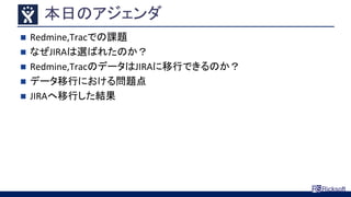 今なぜ「Atlassian JIRA」を使うのか? 「Redmine」「Trac」「IBM Rational ClearQuest」からの移行事例セミナー セッション3 「Redmine」、「Trac」から「Atlassian JIRA」への移行紹介 ツール選定の要因 なぜアトラシアンは選ばれたのか データ移行における課題と効果的な移行方法の紹介 移行後の「Atlassian JIRA」の評価