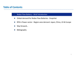 The report discusses the advancements and market potential of redox flow batteries (RFB), emphasizing their modular design, rapid response, and environmental benefits compared to traditional lithium-ion batteries. It highlights the growing global demand for RFBs, particularly in regions like Japan, China, and the US, and predicts a significant increase in market share and applications by 2025. Various projects and technological innovations are detailed, showcasing RFBs' role in energy storage systems, particularly for renewable energy sources.