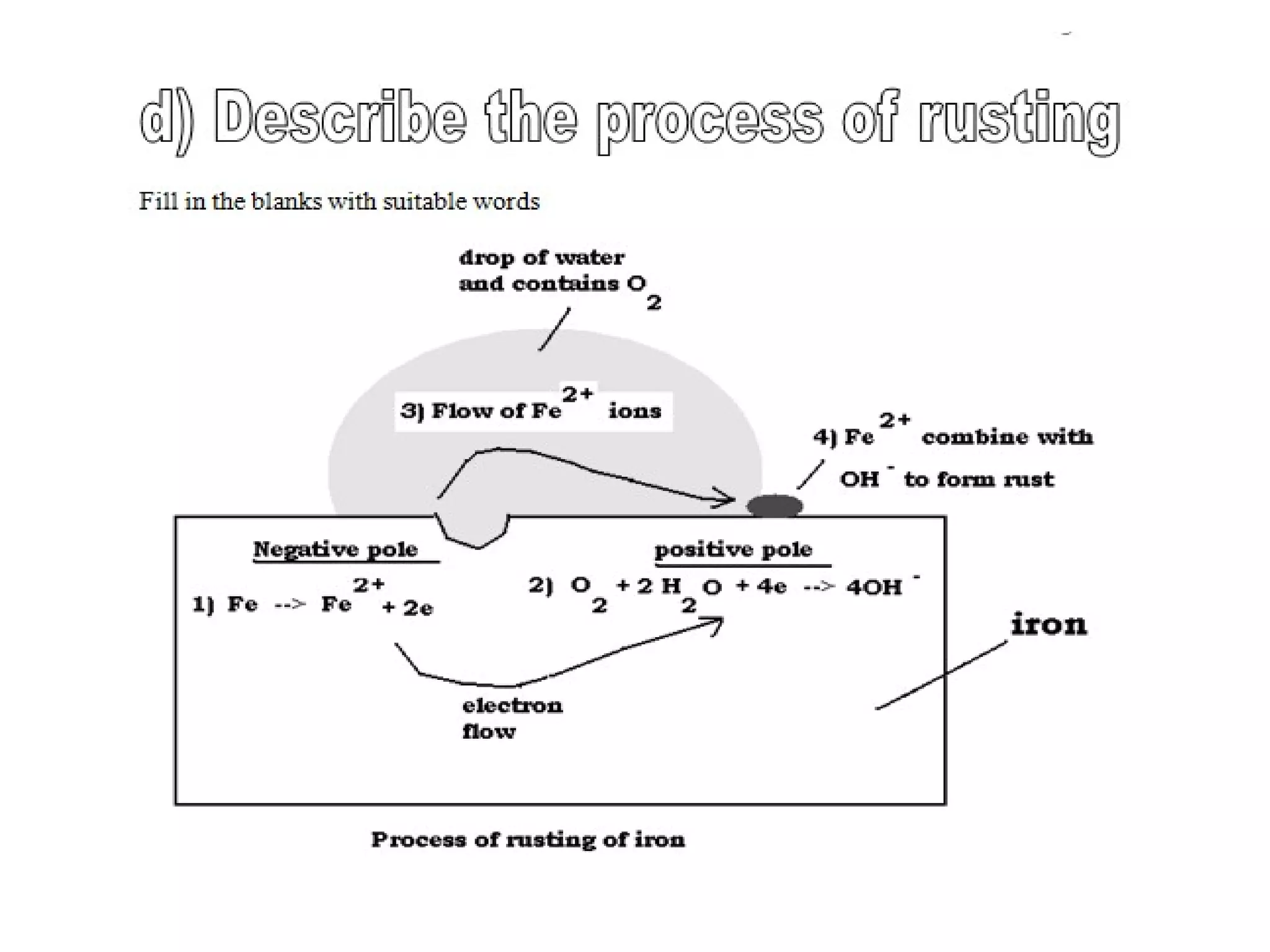 The document discusses the process of rusting, highlighting the chemical reactions involving iron, water, and oxygen that lead to the formation of rust (hydrated iron (III) oxide). It explains the electrochemical principles behind rusting, preventive measures such as protective coatings, and the reactivity series of metals that influence corrosion resistance. Additionally, it includes experimental observations and theoretical explanations for the rusting process and methods of metal extraction.