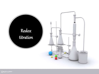 Redox titration is a laboratory method to determine the concentration of an analyte by causing a redox reaction between a titrant and analyte. In redox titration, the titrant is prepared as a standard solution and acts as an oxidizing or reducing agent. It reacts with the analyte until the equivalence point is reached. The endpoint is detected using indicators or sensors that change color upon fully reacting with the analyte. Redox titration has various applications in fields like agriculture, water quality testing, and hydrometallurgy to analyze inorganic compounds. It provides methods for drug formulation and standardization of materials in drug synthesis.