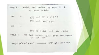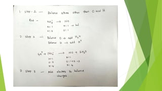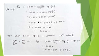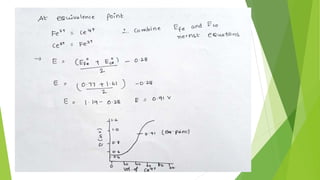 The document outlines redox titrations, focusing on oxidation-reduction reactions, half reactions, and the roles of oxidizing and reducing agents. It describes various titration methods including iodimetry, bromatometry, and dichromatometry, as well as the use of redox indicators and electrodes in these processes. Additionally, the document explains the concept of equivalent weight and the application of different electrodes in measuring redox potentials.