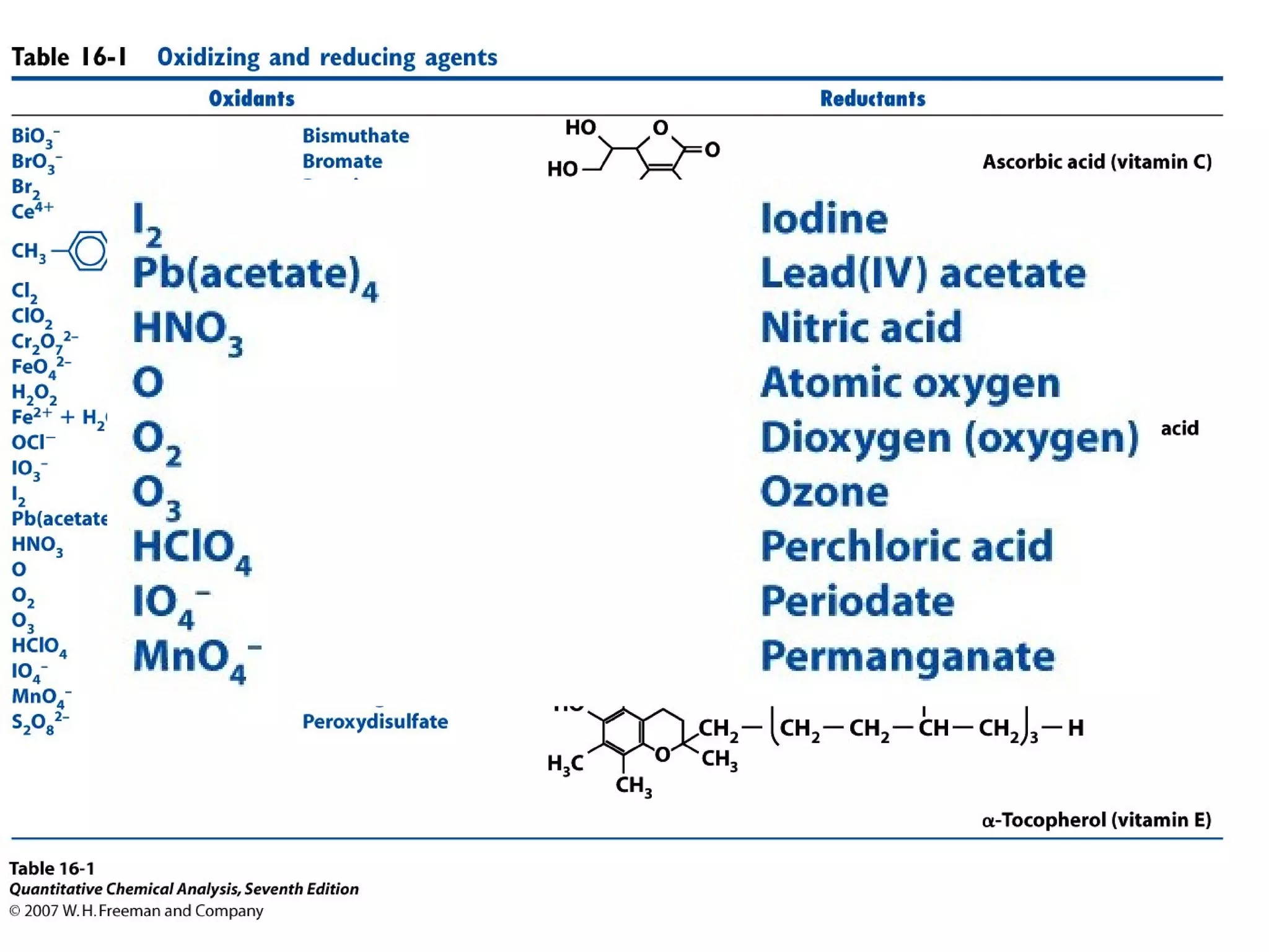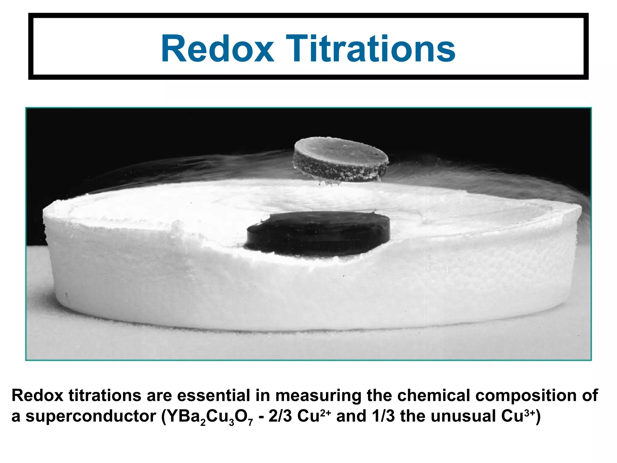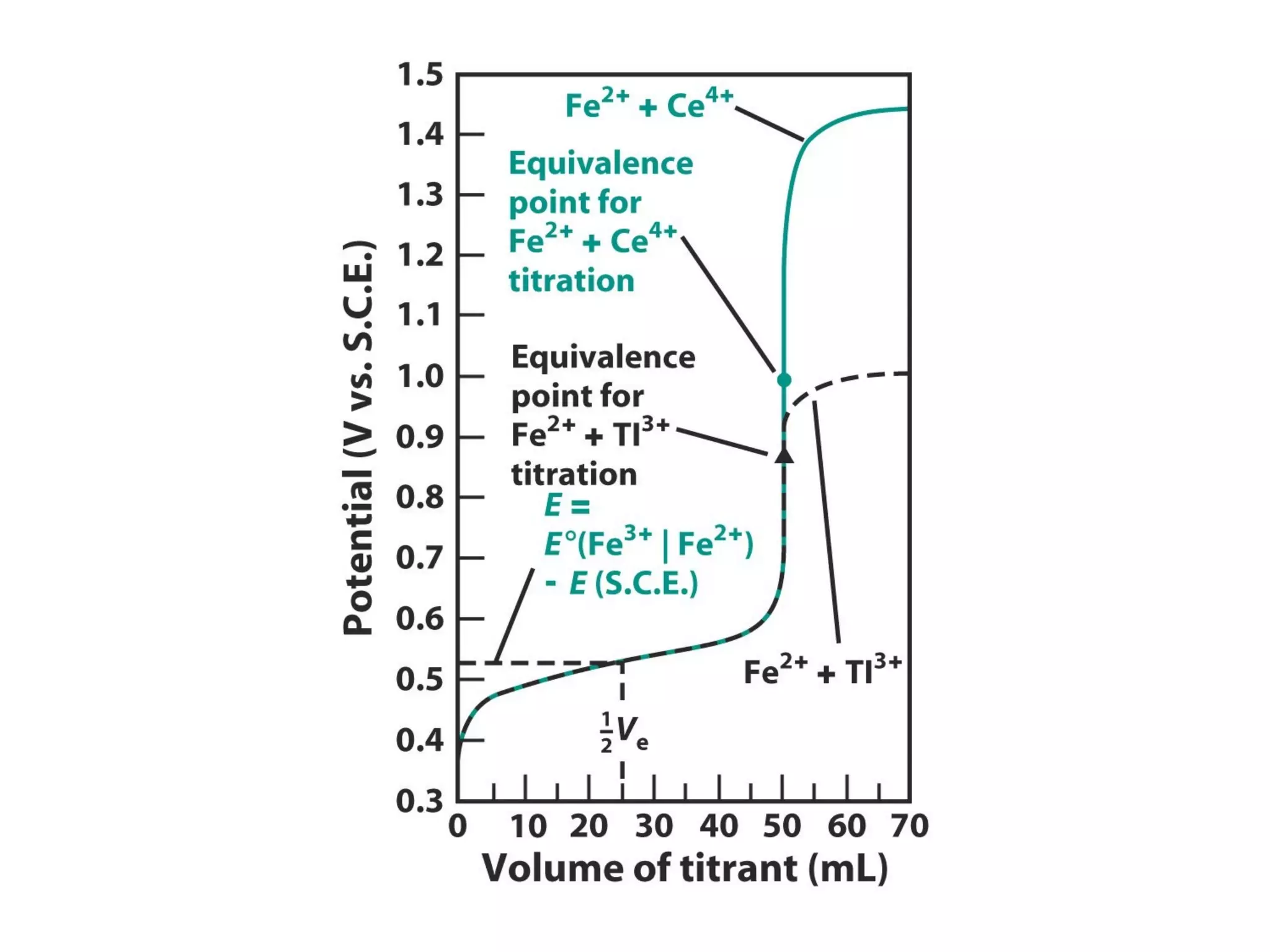 Redox titrations involve the reaction of an oxidizing titrant with a reducing analyte. The document discusses the redox reaction of permanganate (KMnO4) with iron in an ore sample. It also provides the theory behind redox titrations, including Nernst equations that describe the cell potential before, at, and after the equivalence point of the titration reaction. The equivalence point potential can be calculated from the standard reduction potentials of the oxidized and reduced forms of the analyte and titrant.