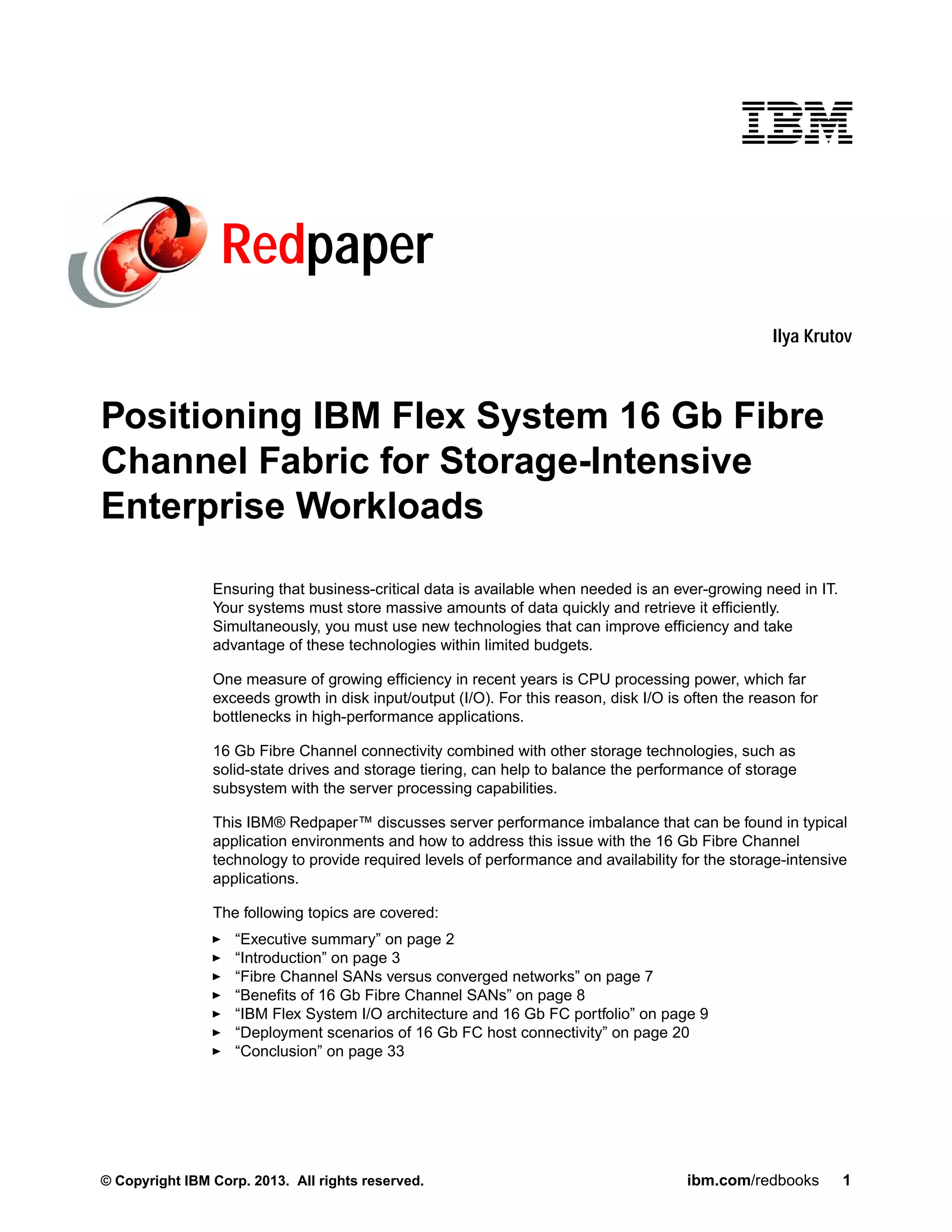The document discusses the importance of 16 GB Fibre Channel technology in optimizing storage solutions for enterprise workloads, highlighting the need for high performance and availability of business-critical data. It outlines how this technology can alleviate performance bottlenecks caused by storage I/O limitations in relation to CPU capabilities, enhancing data processing efficiency. Additionally, it reviews various benefits of implementing this technology, such as increased virtual machine density, reduced total cost of ownership, and better overall system performance.
