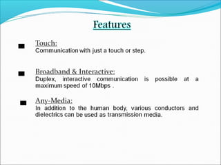 Red Tacton is a novel human area networking technology developed by NTT from Japan, utilizing the surface of the human body as a fast transmission medium for data at speeds up to 10 Mbps. It operates through minute electric fields emitted from the body, ensuring safety as the transceiver's electrodes are insulated to prevent current flow. While it claims advantages over existing technologies in terms of security and reduced network congestion, its practical applications are still limited and may be costly for widespread adoption.