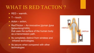 RedTacton is an innovative Human Area Networking technology that uses the human body as a transmission path for data. It transmits data through natural physical movements like touching or walking. RedTacton allows devices to communicate through the body at speeds over 10Mbps, faster than Bluetooth or infrared. It provides a more secure alternative to wireless technologies by using the body as the transmission medium instead of radio frequencies. Potential applications of RedTacton include connected cars, wireless headsets, touchscreens, and security systems that can unlock with a touch.