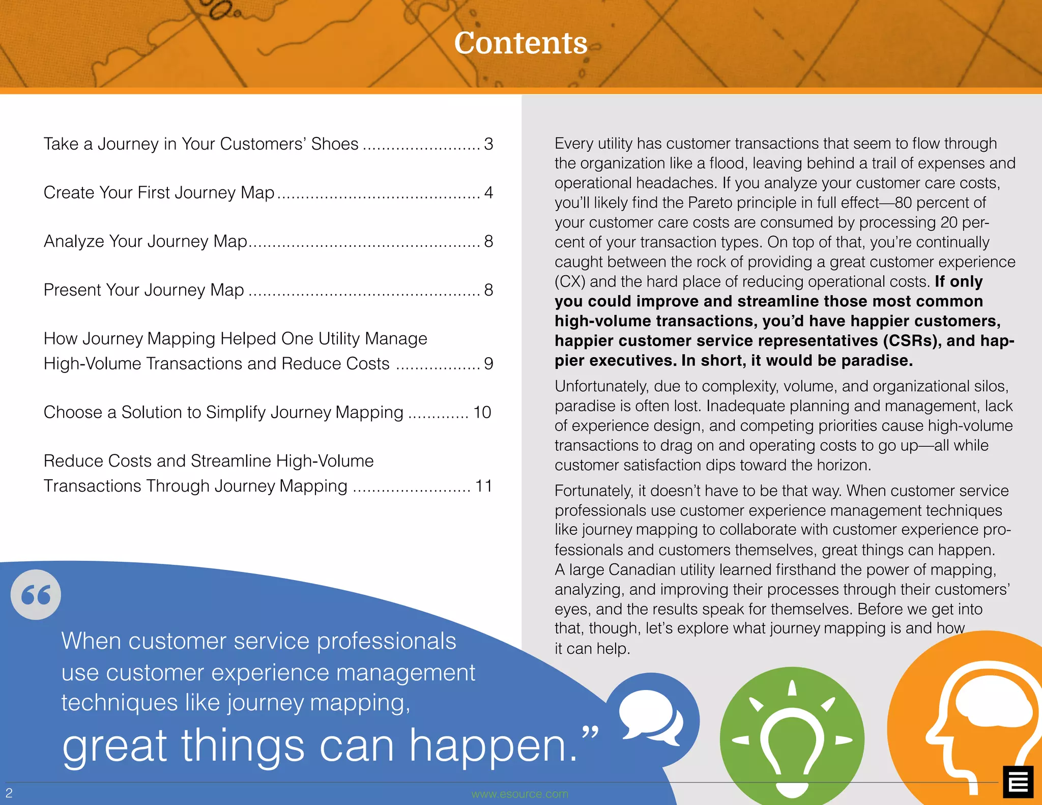 Journey mapping allows utilities to analyze high-volume customer transactions from the customer's perspective. It identifies pain points and opportunities for improvement. A large Canadian utility used journey mapping to understand how customers set up new service after moving. This revealed issues like a difficult website navigation. Simple fixes reduced call volumes and costs. Journey mapping provides benefits like prioritizing improvements, but utilities can simplify the process using cloud-based software and expert guidance.