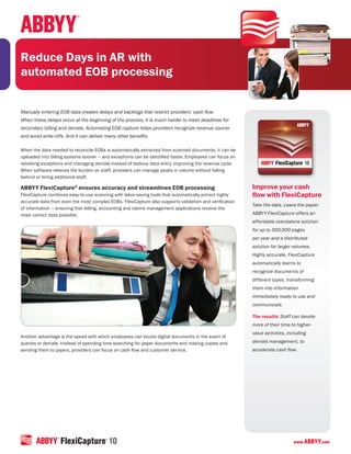 Automating the processing of explanation of benefits (EOB) forms through optical character recognition software can help healthcare providers reduce days in accounts receivable, improve cash flow, and avoid write-offs. It extracts data from EOBs faster than manual entry, allowing billing systems to be updated sooner. Staff spend less time on data entry and more time on higher-value tasks like managing denials and collections. The software can also help providers handle peaks in volume without adding headcount.