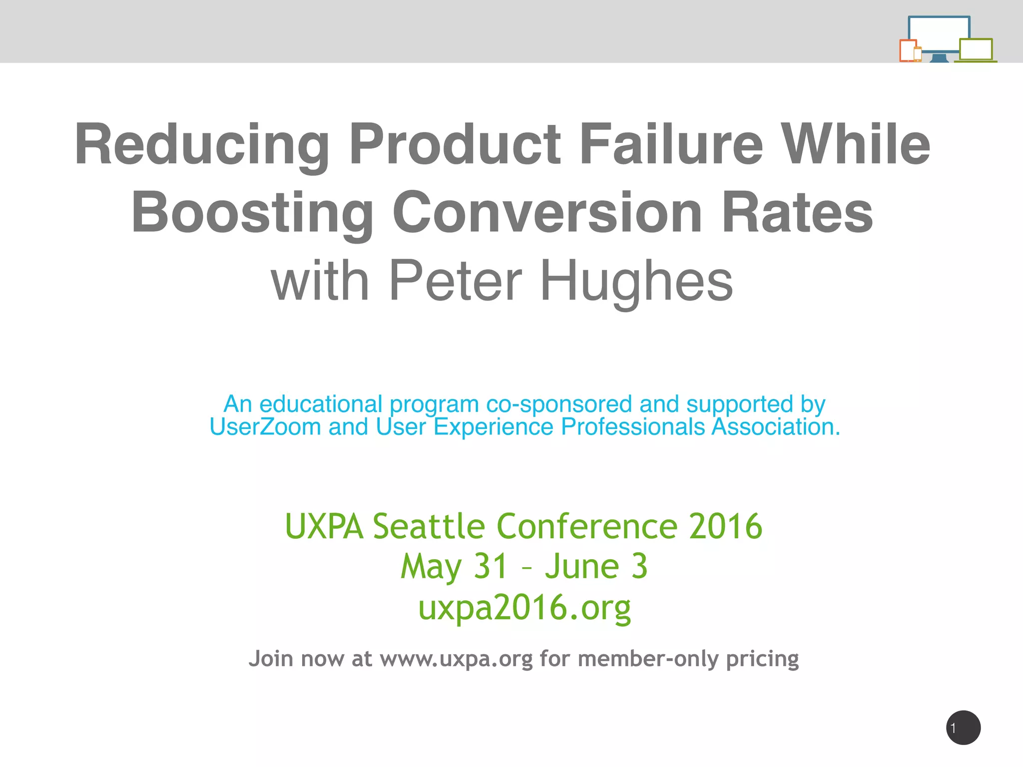 This document outlines an educational program focused on reducing product failure and enhancing conversion rates, featuring a webinar hosted by Peter Hughes and supported by UserZoom and the User Experience Professionals Association. It includes information on usability testing techniques, metrics for measuring conversion satisfaction, and tips for improving digital product relevance and engagement. Participants are encouraged to interact and will receive access to recorded content and additional resources.