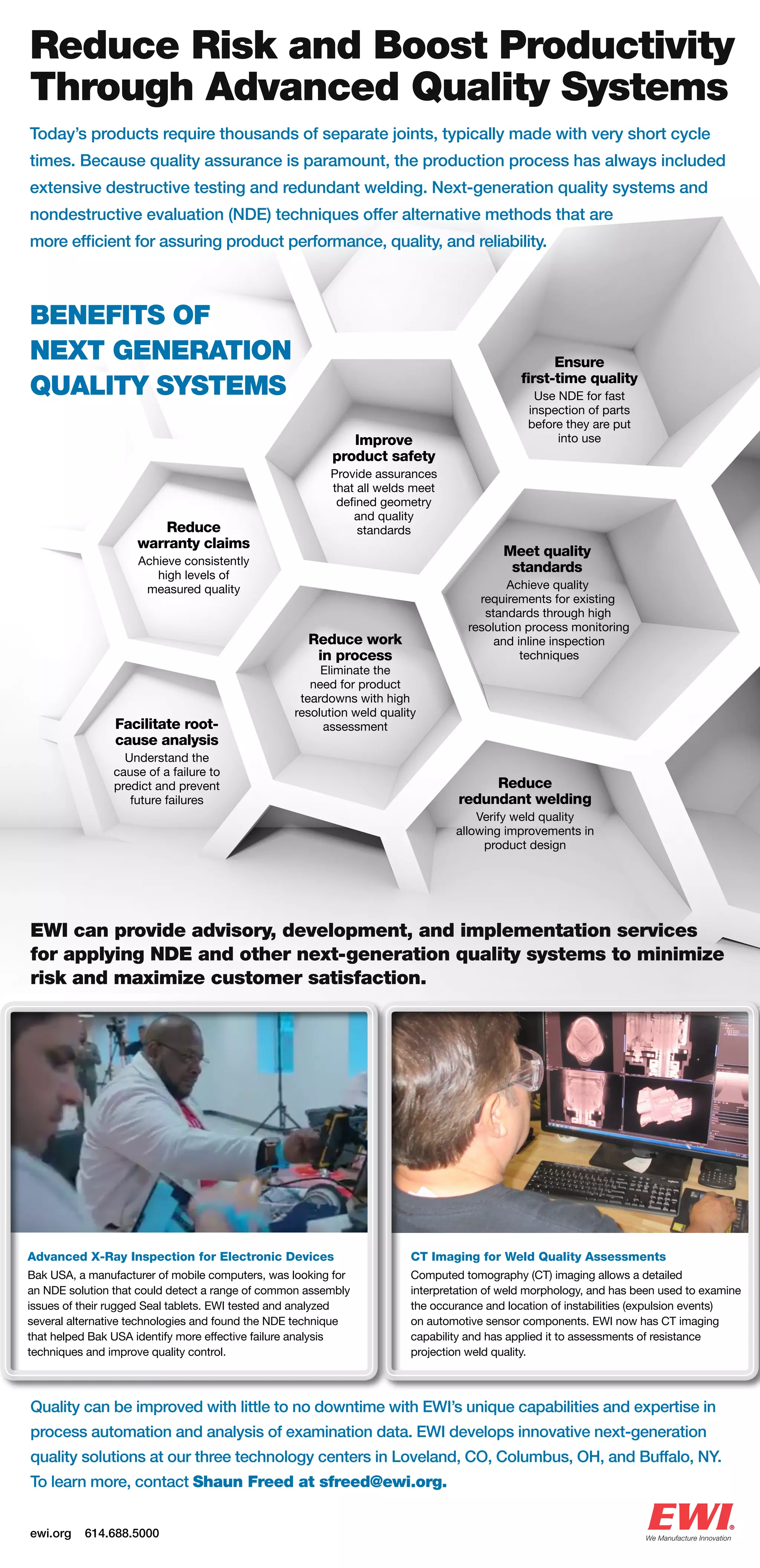 EWI specializes in improving quality through process automation and inspection techniques, utilizing three technology centers in the U.S. Their next-generation quality systems and nondestructive evaluation (NDE) methods reduce risks and enhance productivity, offering efficient alternatives to traditional testing. EWI's innovations include CT imaging for weld assessments and advanced x-ray inspection for electronic devices, providing manufacturers with improved quality control solutions.