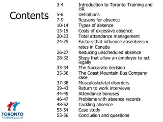 This document provides an overview of reducing absenteeism in the workplace. It discusses definitions of different types of absences, reasons for absence, costs of excessive absence, factors that influence rates in Canada, legally reducing unscheduled absences, return to work interviews, attendance bonuses, problems with absence records, and tackling absence. The document contains information to help employers understand and manage absenteeism through establishing clear policies, engaging managers, addressing underlying causes, and focusing on communication and early intervention.