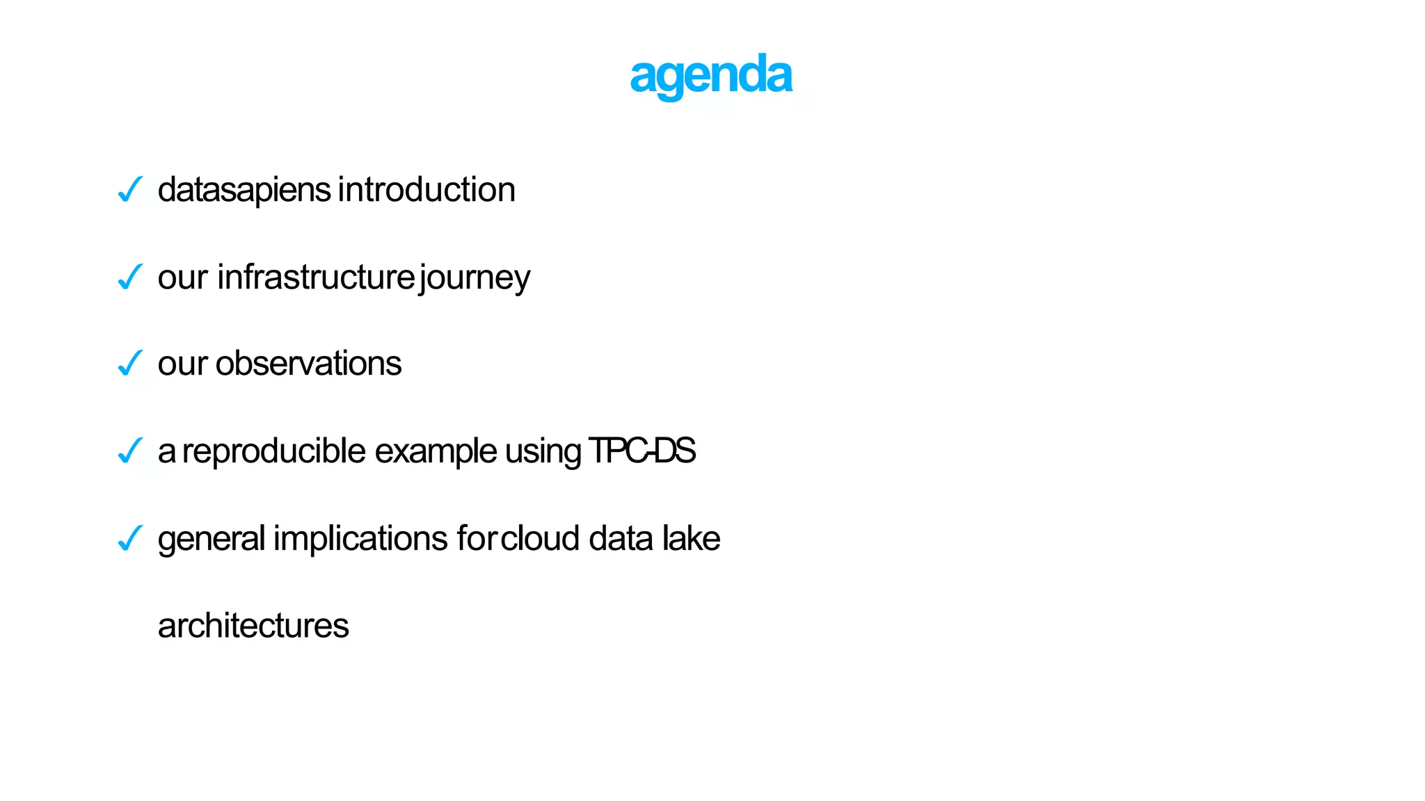 The document discusses the infrastructure journey and product offerings of Datasapiens, focusing on their data platform development across generations and performance tests using a Presto cluster. It highlights improvements in cost and performance metrics, particularly emphasizing the benefits of Alluxio in reducing S3 API costs significantly. The document concludes with implications for cloud data lake architectures, advocating for the use of intermediate storage layers to optimize costs.