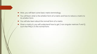 The document provides an overview of reducing matrices to normal form in linear algebra, including basic matrix terminology and the concept of echelon form. It explains how to perform elementary row and column operations to achieve normal form, as well as how to identify the rank of a matrix. Essential techniques include finding two non-singular matrices, p and q, such that paq is in normal form.
