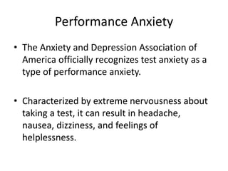 This document provides strategies and tips for students experiencing test anxiety. It discusses how test anxiety is a type of performance anxiety characterized by extreme nervousness during tests. It recommends that students prepare thoroughly, keep tests in perspective and not let a single test determine their self-worth. The document also suggests focusing on positive past test experiences and visualizing success. Teachers are advised to help students identify the source of their anxiety and create review plans. Additional resources like academic support services and testing accommodations are also mentioned to help reduce anxiety and improve performance.