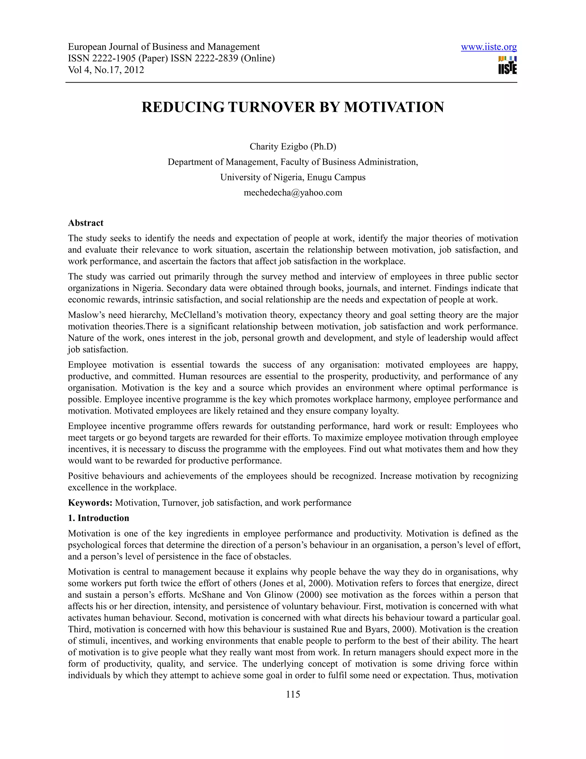 This document summarizes a study on reducing employee turnover through motivation. The study aimed to identify employee needs and expectations, review motivation theories, and examine the relationship between motivation, job satisfaction, and performance. It also sought to determine factors affecting job satisfaction. The study was conducted through surveys and interviews of employees in three Nigerian public sector organizations. Key findings included that economic rewards, intrinsic satisfaction, and social relationships are important employee needs and expectations. Major motivation theories discussed included Maslow's hierarchy of needs, McClelland's learned needs theory, expectancy theory, and goal setting theory. The study found a significant relationship between motivation, job satisfaction, and work performance. Factors like the nature of work, interest in the job, growth opportunities