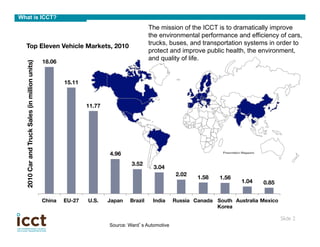 This document compares India's program for reducing vehicular emissions to global benchmarks. While India has implemented vehicle emission standards and fuel quality standards on schedule, its standards are still 6-10 years behind other major markets. Opportunities for improvement include adopting more stringent exhaust emission standards, strengthening evaporative emission standards, improving durability requirements, and linking in-use inspection data to a national compliance program. Preliminary recommendations include adopting more representative test cycles, emphasizing real-world emissions performance, and establishing a long-term roadmap to close gaps with best practices.