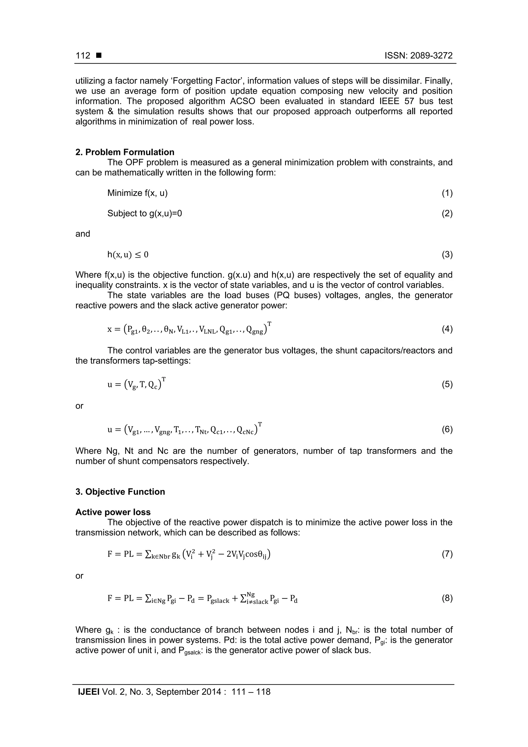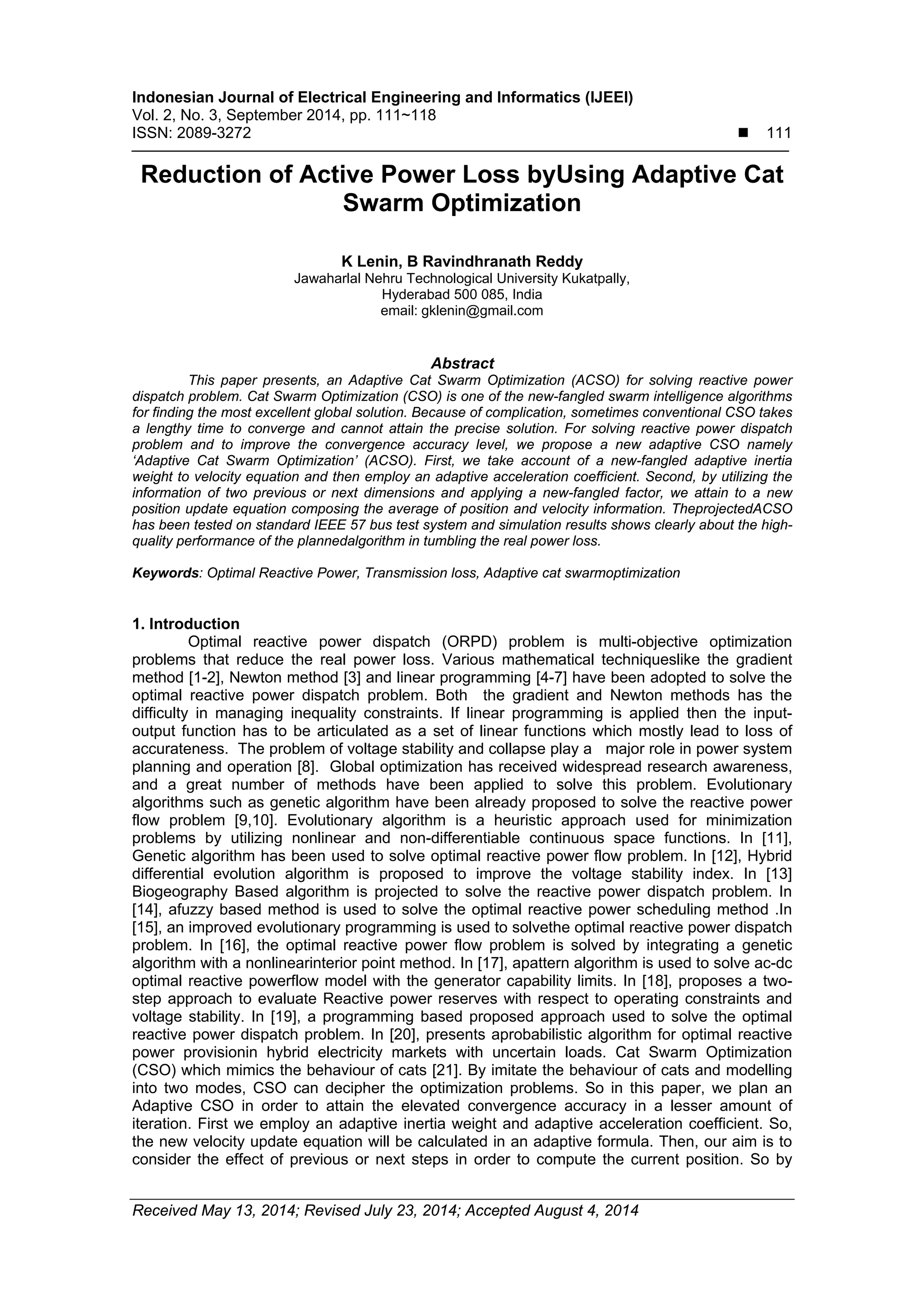 The document presents an adaptive cat swarm optimization (ACSO) algorithm designed to solve the reactive power dispatch problem, focusing on reducing active power loss. By incorporating adaptive inertia weights and acceleration coefficients, the proposed method enhances convergence accuracy while applying it to the IEEE 57 bus test system, demonstrating superior performance compared to traditional methods. Simulation results validate the efficacy of ACSO in minimizing real power loss, establishing it as a robust optimization strategy.