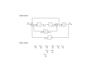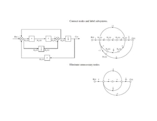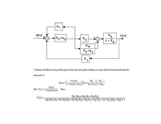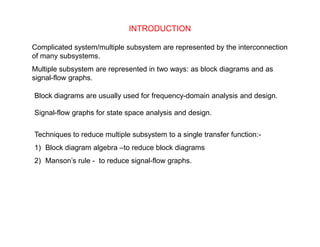 This document discusses techniques for reducing multiple subsystems to a single transfer function. It covers block diagram algebra and Manson's rule. Block diagram algebra can be used to reduce block diagrams representing cascaded, parallel, and feedback subsystems into equivalent single transfer functions. The key techniques are collapsing summing junctions and forming equivalent cascaded, parallel, and feedback systems. Signal-flow graphs also represent subsystems and can be reduced using Manson's rule by writing equations for each signal as the sum of incoming signals times their transfer functions. Examples demonstrate reducing various block diagrams and signal-flow graphs to equivalent single transfer functions.