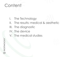 The document discusses biostimology, a technology aimed at reducing abdominal obesity and metabolic syndrome through non-destructive muscular stimulation. It highlights the effectiveness of this treatment in improving metabolic markers and reducing visceral fat without invasive procedures. Biostimology is clinically proven to benefit various health issues, including diabetes and fatty liver disease, with specific protocols for different obesity classes.