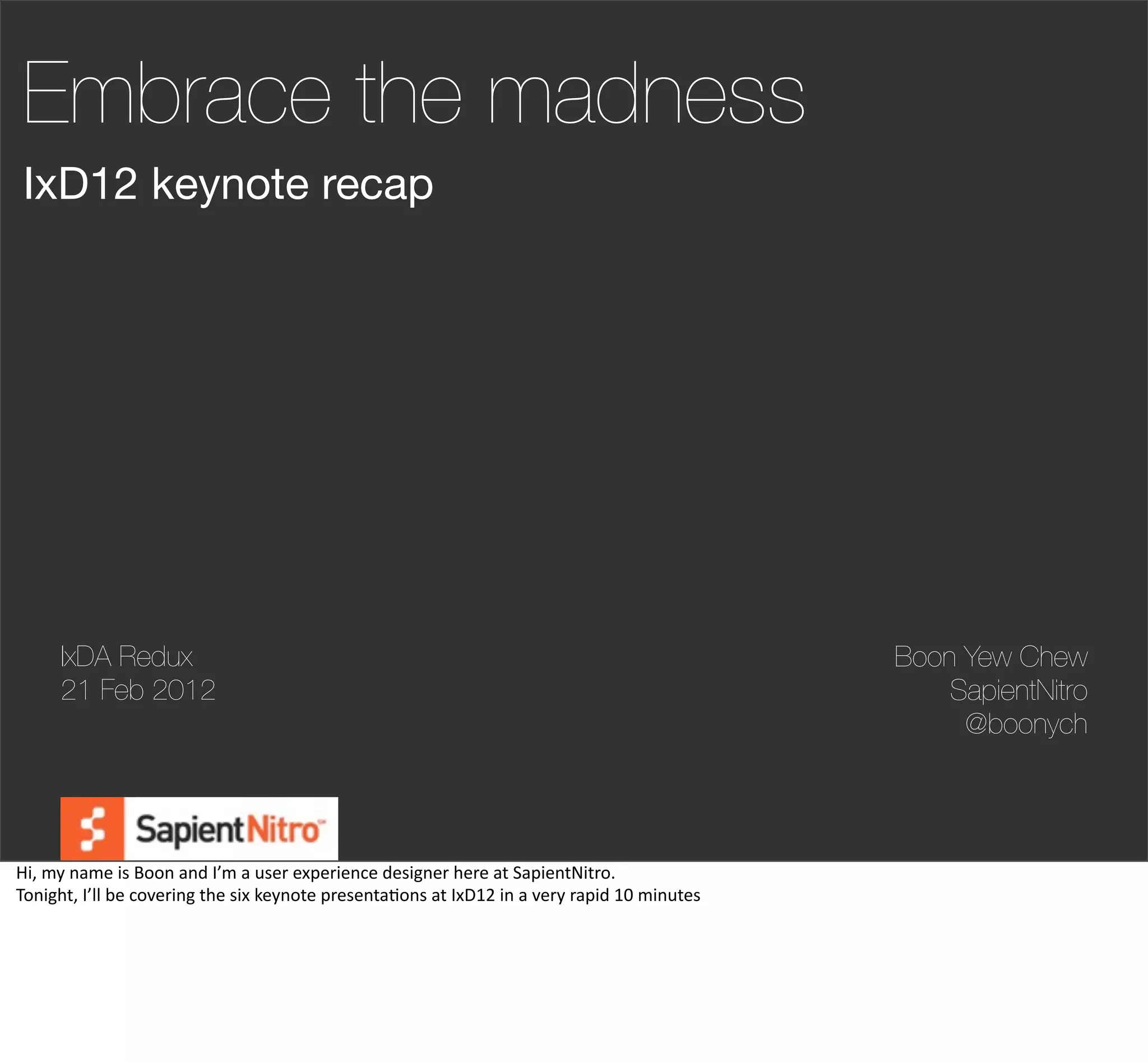 The keynote document provides a summary of six presentations given at the IxD12 conference. The presentations focused on how interaction design is changing and where it needs to head in the future. The document summarizes that the presenters called for designers to embrace the growing complexity and unpredictability in technology by focusing on disruptive rather than practical ideas, provoking change rather than just predicting trends, and exploring what could be rather than what should be through the use of "what if" thinking.