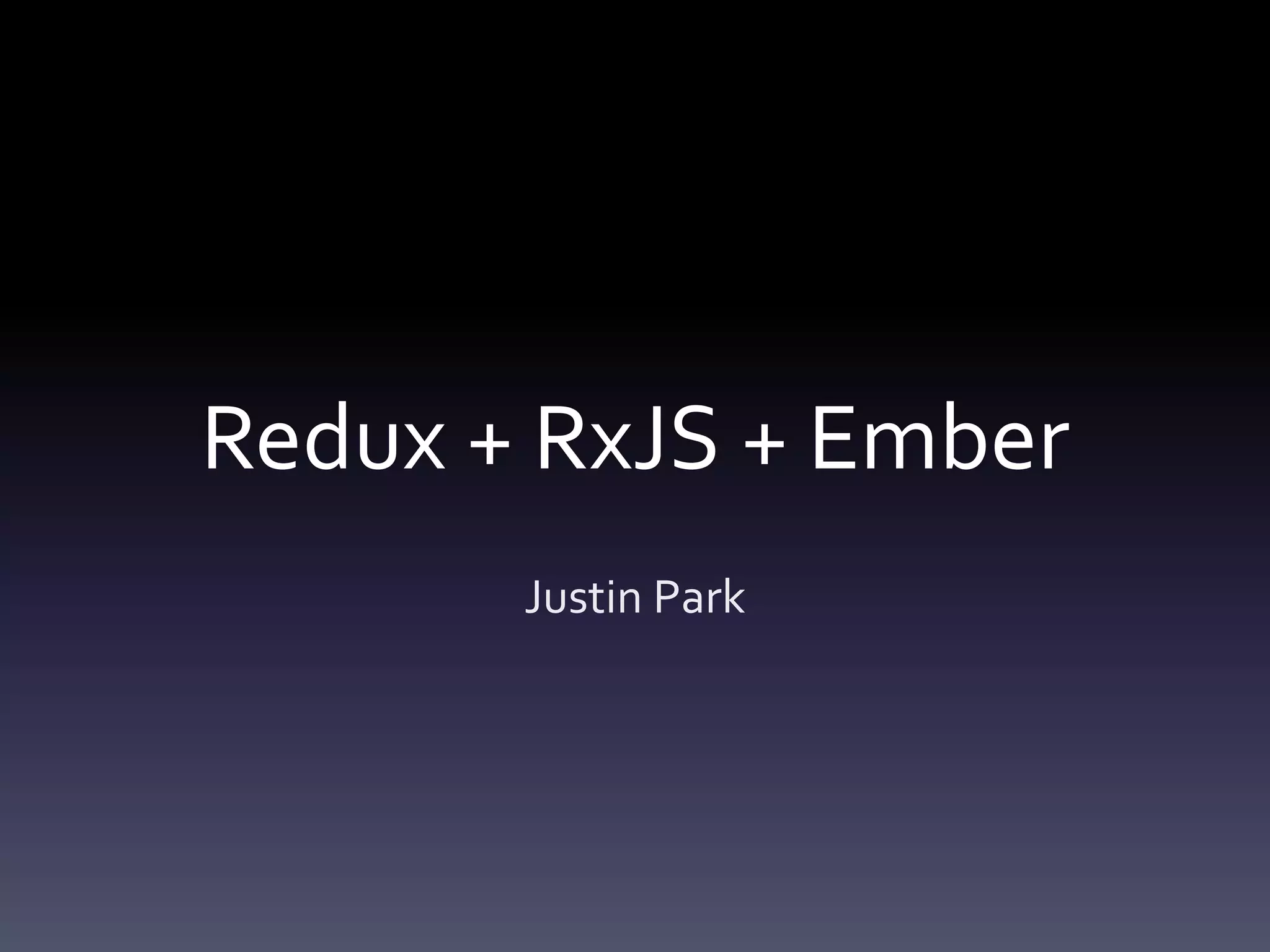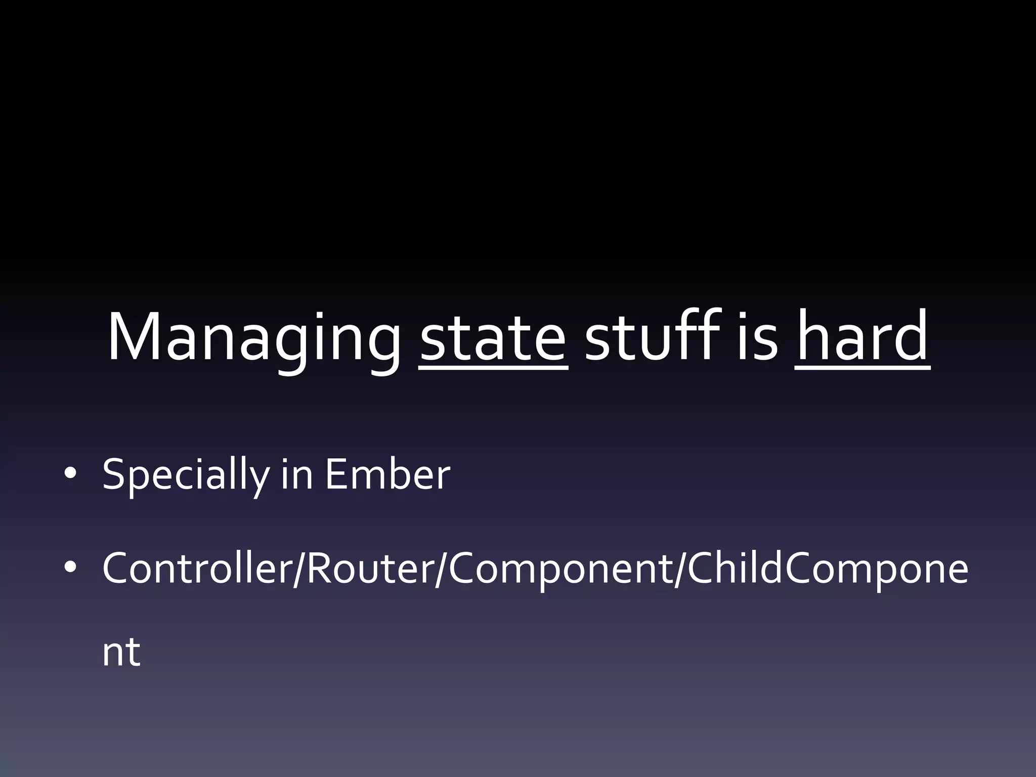 This document discusses managing state in Ember applications and introduces Redux and RxJS as solutions. It provides an overview of key concepts in Redux like actions, reducers, and combining reducers. It then discusses how RxJS can be used to manage asynchronous logic in a declarative way, including examples of fetching search results, aborting requests, and handling subsequent dependent requests.