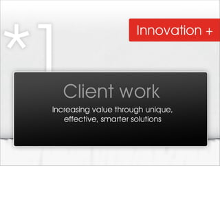 The document discusses how Redweb, an agency that won an award for Most Innovative Agency, cultivates innovation through creativity. It invests in developing innovative thinking among its staff by encouraging experimentation and allowing ideas to diverge and fail occasionally. Some of Redweb's innovative projects in 2010 included a Wheel of Tea iPhone app, augmented reality apps, social games connecting mobile phones to public screens, and hack days where staff solve problems. The agency's approach of valuing creativity, time for exploration and not fearing failure has led to numerous nominations for innovation awards.