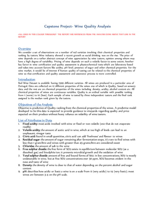 This document discusses analyzing wine quality using chemical properties data from red wine varieties in Portugal. The objectives are to predict quality ranking from chemical properties and provide guidance to vineyards without relying on wine tasters. Various analyses are performed, including basic statistics, histograms, correlation matrices, scatter plots, and hypothesis testing. Linear regression models find alcohol content is highly correlated with quality.