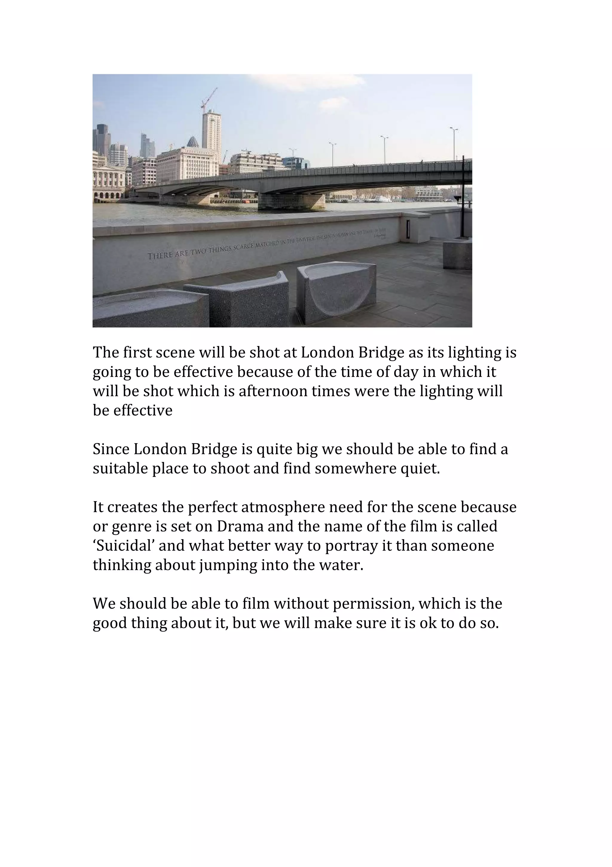 The document discusses three potential filming locations for a movie scene: London Bridge in the afternoon for a character considering suicide, Clapton train station which is close to college and rarely busy, and the school library to portray a character being bullied. London Bridge would provide effective lighting and atmosphere for drama, while Clapton station also has sufficient lighting and space. Permission is likely needed for the train station and definitely for the library, but London Bridge may be filmed without permission if possible.