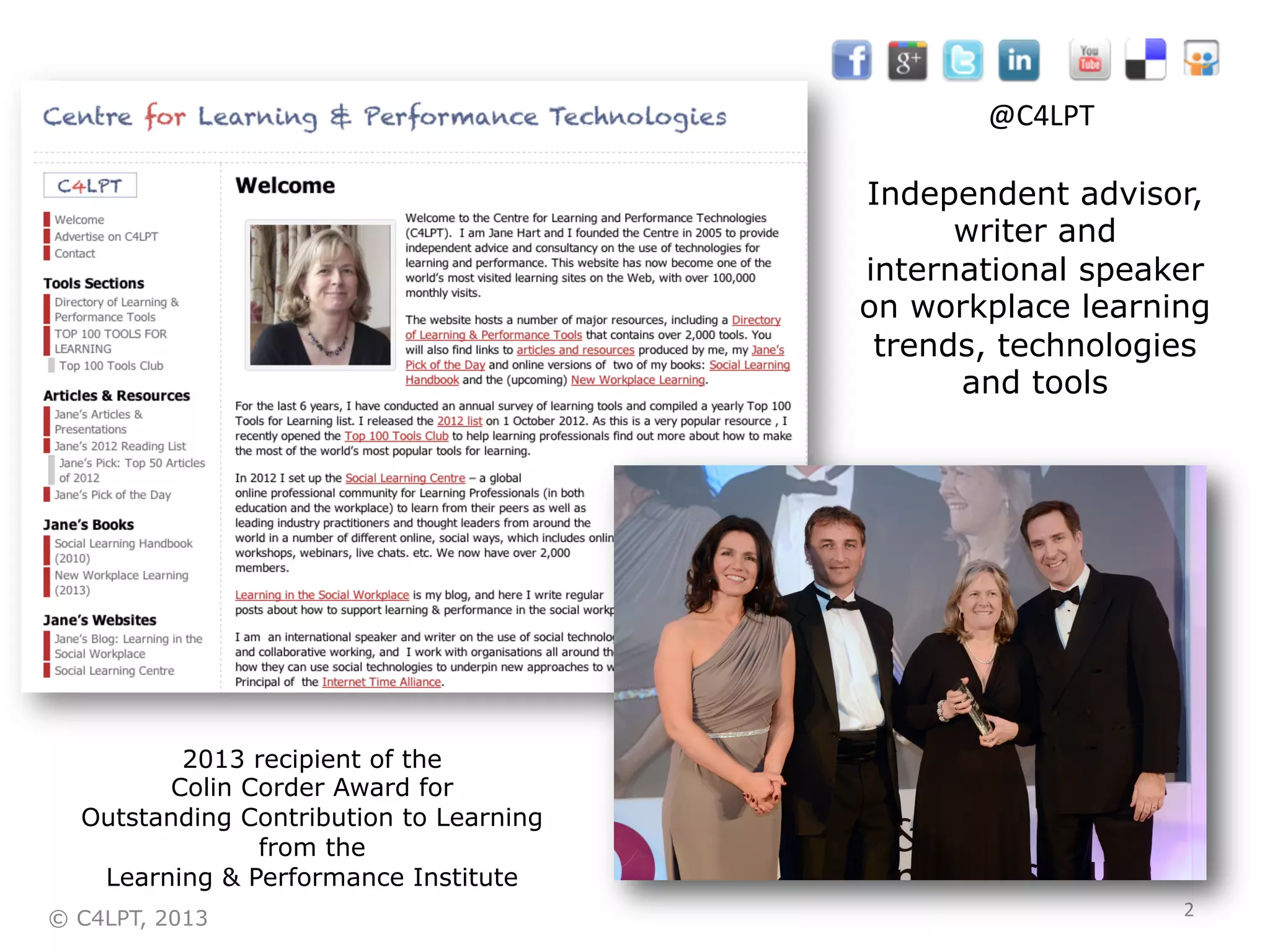 Jane Hart gave a presentation on how learning and development is changing in a social world. She discussed how individuals are using social tools like Twitter and Google Drive to build personal learning networks for sharing knowledge and learning from colleagues. New enterprise social networks are also emerging that allow teams to collaborate more effectively. Learning and development professionals need to rethink their practices and support workplace learning in more modern ways using social media, online communities and other new approaches.