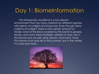 The temperate woodland biome has many habitats for different species with plenty of sunlight and resources, though only some shade. It is covered primarily by grasses, shrubs, and various tree species like oak and pine. This biome experiences hot, dry summers and cold, moist winters. It contains many biotic factors including various plants, insects, and animal species like deer, foxes, owls, and more. Abiotic factors include fertile soil, small ponds, creeks, rocks, gases, and sunlight.