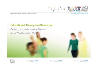 The document discusses the role of simulation in medical education, emphasizing the importance of cognitive theories and learning sciences to inform and evaluate its effectiveness. It raises questions about the nature of learning in simulation, the roles of participants, and the impact of social and environmental contexts on the learning experience. Additionally, it highlights various theoretical perspectives that can enhance understanding and design of simulations in medical training.