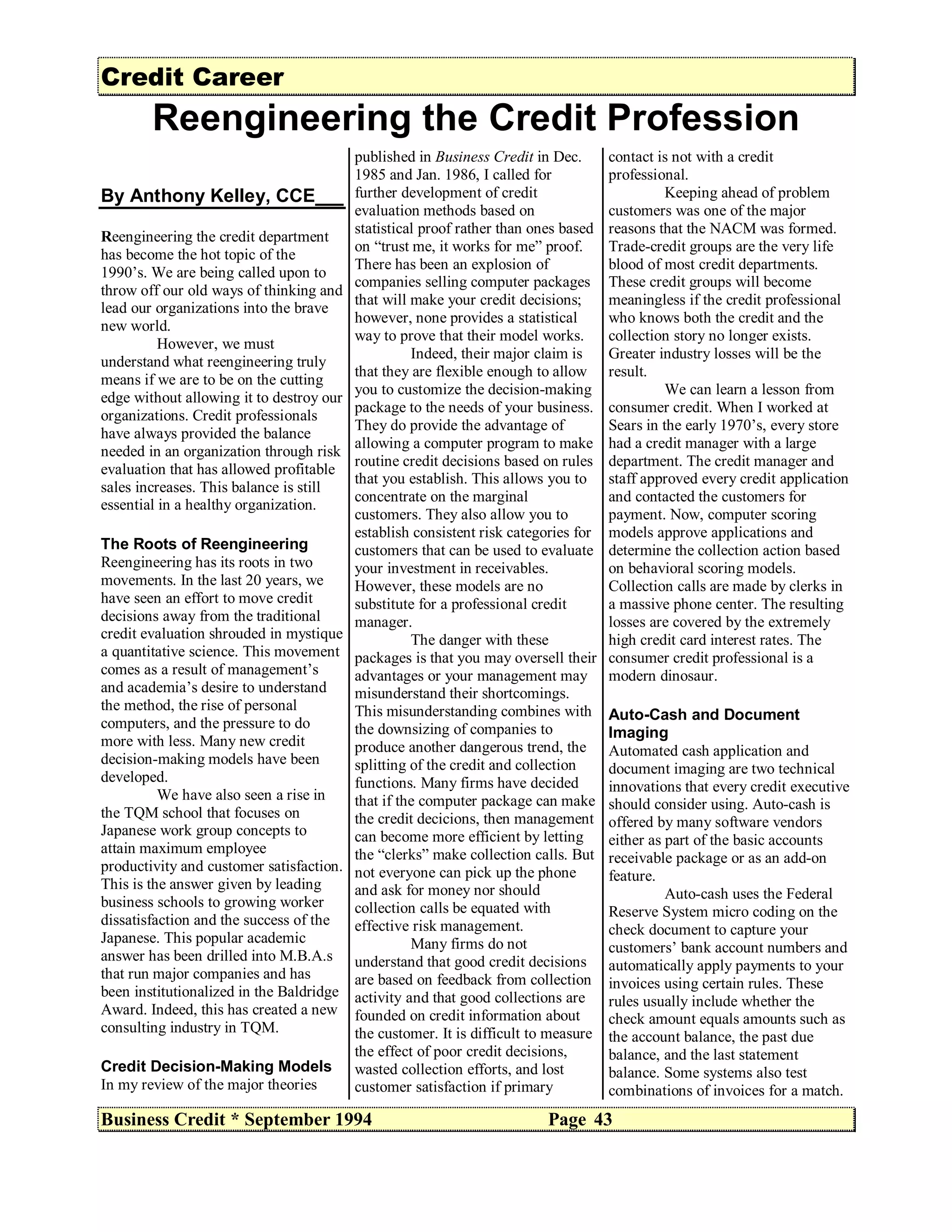 Reengineering the credit profession has become a major focus in the 1990s, as credit departments are called to modernize their practices. However, reengineering efforts must be implemented carefully to avoid losing the essential balance and risk evaluation that credit professionals provide. While tools like credit decision models, auto-cash applications, and document imaging can increase efficiency, they are not a replacement for experienced credit managers. TQM and business schools have also led some companies to misuse reengineering by eliminating credit experts, despite their importance to healthy organizations. For the credit profession to thrive, efforts must focus on research, education, and credentials to develop the next generation of professionals.