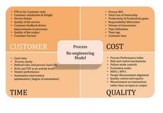 This document discusses re-engineering and provides details about Satish Patel's study of the topic for his Industrial Engineering course. It defines re-engineering as the radical redesign of business processes to achieve improvements in areas like cost, quality and speed. The document outlines the basic steps of re-engineering, why it is necessary due to factors like changing customer demands and technologies. It also discusses skills required, how to avoid failures and the four stages of change that organizations may experience when implementing re-engineering.