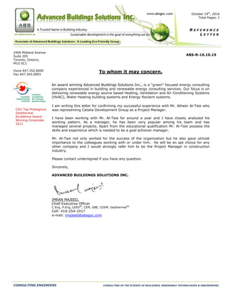 This reference letter from Advanced Buildings Solutions Inc. recommends Atheer Al-Taie for a project manager position. It details that Al-Taie worked with them for around a year managing several projects successfully. The letter also states that as a manager, Al-Taie was popular among his team and gave importance to colleagues. The CEO of Advanced Buildings Solutions Inc. strongly refers Al-Taie for a project manager role in the construction industry.