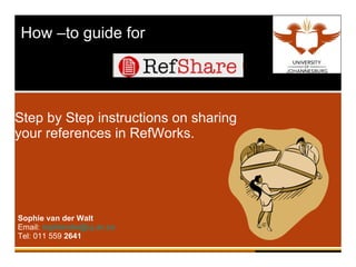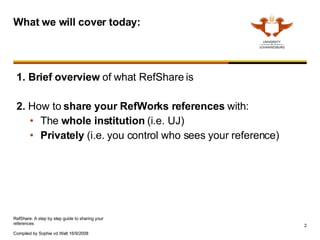 This document provides step-by-step instructions for sharing references in RefWorks in two ways: 1) From the folder option or 2) From the tools area. It explains how to share entire folders or databases, set permissions for sharing, and include shared references in the university's shared area or share privately by emailing the URL. Tips are provided for what content can be accessed in shared folders depending on permissions. Contact information is given for getting additional help with RefShare.