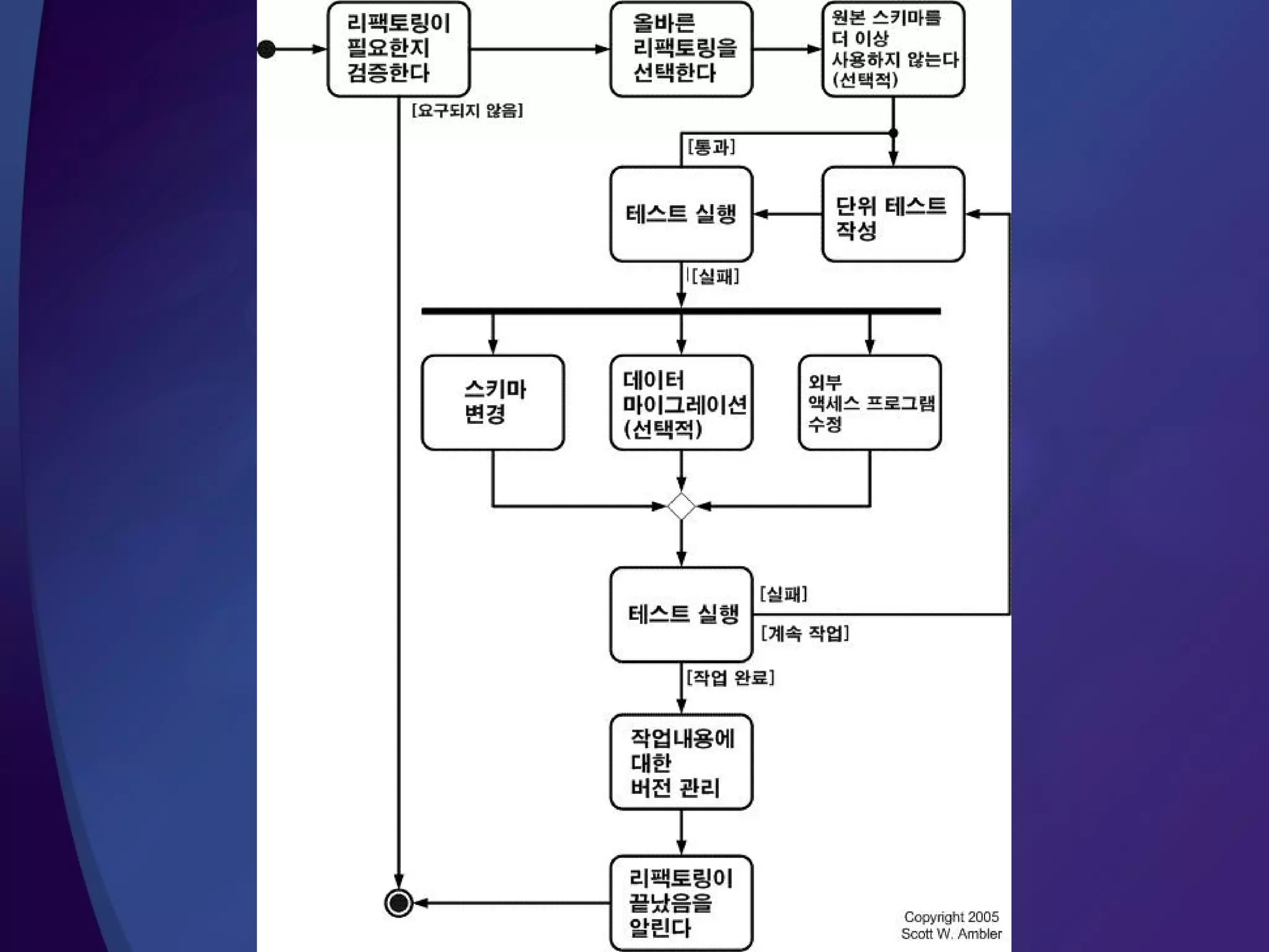 refactoring database 1. 2. 목차 왜 리팩토링 데이터베이스 ? 데이터베이스 리팩토링 데이터베이스 리팩토링 프로세스 단위 테스트 작성하기 3. 4. 전통적인 데이터베이스 지속적인 변화가 허용되지 않는다 . 완제품의 변경이 드물다 . 잘못된 설계에 대한 이슈를 고치기 두렵다 . 마이그레이션은 거의 프로젝트 수준 변경 관리가 없다 . 데이터베이스 마이그레이션 테스트가 없다 . 5. 진화적인 데이터베이스 천천히 안전하게 데이터베이스를 변경한다 . 변경이 관리된다 . 기획 , 기능은 계속해서 변경되고 추가된다 . 자동화된 테스트 만들기가 쉽다 . 기능별로 개발자마다 지식이 쌓인다 . 팀 상호작용의 중요성 인식 DBA = Role != Person 6. DBA 와 협력하기 DBA 가 어플리케이션을 이해할 수 있도록 돕는다 . DBA 가 스크립트 바꾸는 것을 도와줄 것이다 . 당신이 데이터베이스 테스트 작성하는 것을 도와줄 것이다 . 데이터의 마이그레이션 코드처럼 위험한 것은 DBA 가 대신 만들어 줄 것이다 . SQL 튜닝등에 대한 지식을 얻을 수 있다 . 7. Everyone gets a Database 데이터베이스 인스턴스 = 어플리케이션 인스턴스 개발자는 다른 개발자들과 독립적으로 작업할 수 있다 . 데이터베이스 건드리는 것에 자유를 얻는다 . 데이터베이스 작업에 CI 툴을 사용한다 . 데이터베이스는 단지 스키마일 수 있다 . 8. 9. 10. 11. 12. 13. 14. 데이터베이스 냄새 다목적 컬럼 다목적 테이블 여분의 데이터 너무 많은 컬럼을 가진 테이블 너무 많은 행을 가진 테이블 스마트 컬럼 변경에 대한 두려움 15. 16. 17. 18. 테스트 , 테스트 리팩토링 전 , 후는 물론 리팩토링 도중에도 계속 테스트를 한다 . 종류 데이터베이스 스키마 테스트 애플리케이션이 데이터베이스 스키마를 사용하는 방법을 테스트 데이터 마이그레이션 검증 외부 프로그램 코드 테스트 19. 20. 21. 22. 23. 24. 25. 26. 27. 28. 29. 테스트 항목 Find All - 예상한 만큼의 row 개수 Find one - 가져온 레코드의 모든 값 ( 컬럼 ) Insert multiple records – 추가된 레코드 Insert duplicates – 제약 사항 어기는 것 시도 Delete, Delete multiple – 진짜로 제거되었는지 확인 Update – 수정된 내용 확인 Violate constraints – 모든 가능한 가상 제약들을 테스트했는지 확인 Optimistic locking - 낙관적인 락킹 예외가 제대로 동작했는지 확인 30. 31. 32.