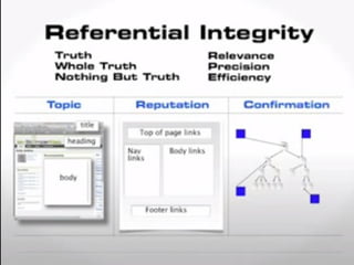 The document discusses Google's use of Latent Semantic Indexing (LSI) and its approach to referential integrity in search rankings. It explains the importance of targeting the 'whole truth' in content for effective SEO, balancing specificity and breadth to avoid competition pitfalls. Additionally, it highlights the role of reputation and confirmation in link building and the need for precise anchor text to enhance search relevance.