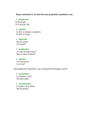 Documentul discută despre sintaxa propozițiilor, oferind tipuri diferite de propoziții, inclusiv simple și dezvoltate, precum și caracteristicile acestora. Se explică relațiile dintre propoziții principale și subordonate, precum și vocabularul limbii române, incluzând definiții pentru sinonime, antonime și omonime. De asemenea, sunt prezentate conceptele de cuvinte polisemantice și monosemantice.