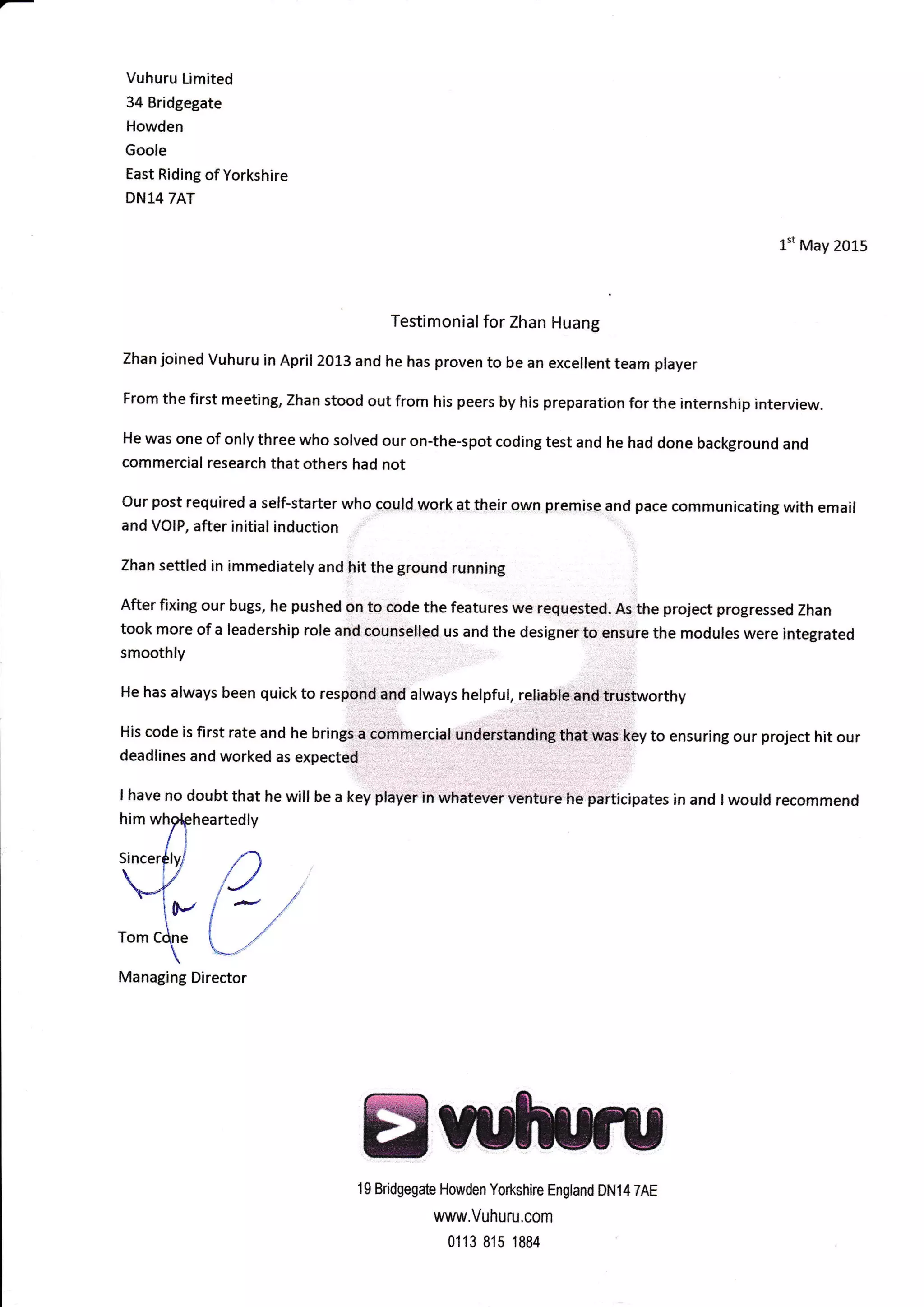 Zhan joined Vuhuru in 2013 and has proven to be an excellent team player and self-starter. He stood out during the internship interview by thoroughly preparing and solving their on-the-spot coding test. As the project progressed, Zhan took on more of a leadership role, fixing bugs and coding requested features while also counseling the team to ensure smooth integration of modules. The managing director commended Zhan for his work at Vuhuru in this testimonial letter.